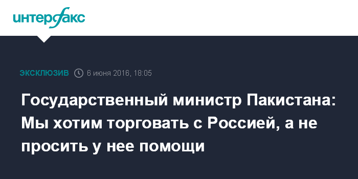 Государственный министр Пакистана: Мы хотим торговать с Россией, а не просить у нее помощи