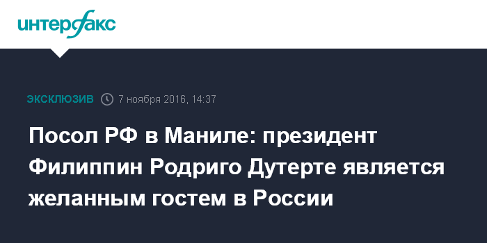 Посол РФ в Маниле: президент Филиппин Родриго Дутерте является желанным гостем в России