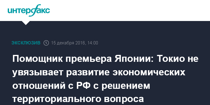 Помощник премьера Японии: Токио не увязывает развитие экономических отношений с РФ с решением территориального вопроса
