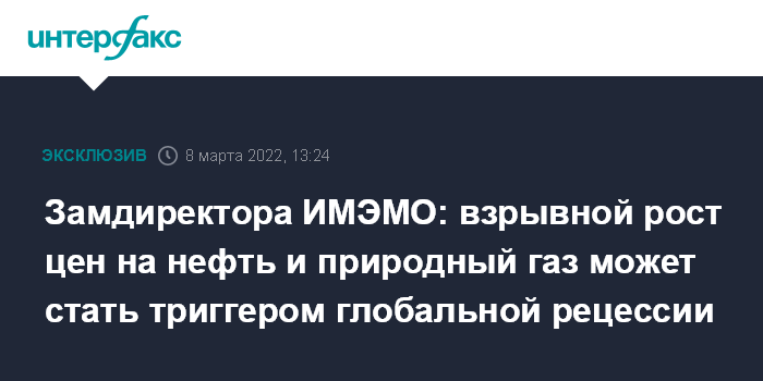 Замдиректора ИМЭМО: взрывной рост цен на нефть и природный газ может стать триггером глобальной рецессии