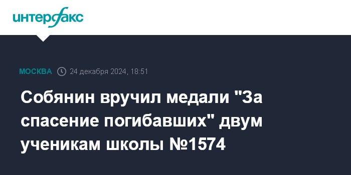 Собянин вручил медали "За спасение погибавших" двум ученикам школы №1574