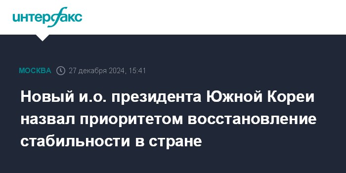 Москва. 27 декабря. INTERFAX.RU - Новый исполняющий обязанности президента Южной Кореи вице-премьер Чхве Сан Мок заявил в пятницу, что его главной задачей на этом посту станет стабилизация ситуации в стране.