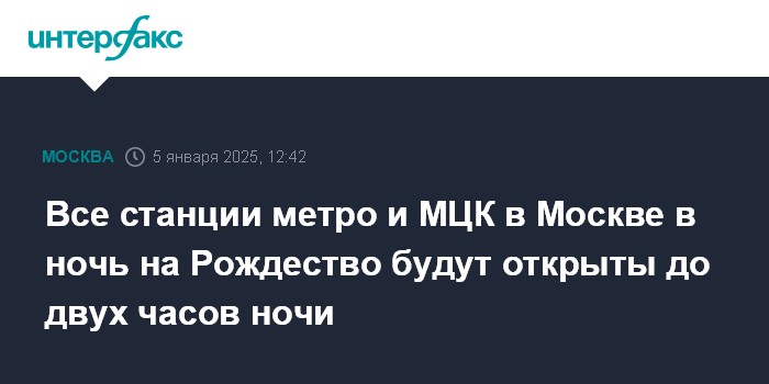 Москва. 5 января. INTERFAX.RU - В столице в ночь с 6 на 7 января все станции метро и Московского центрального кольца (МЦК) будут открыты до 02:00; поезда Московских центральных диаметров (МЦД) будут следовать до 03:00, сообщил в воскресенье в телеграм-канале департамент транспорта Москвы.