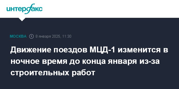 Москва. 8 января. INTERFAX.RU - Движение поездов первой линии Московских центральных диаметров (МЦД-1) изменится в ночное время после 19:00 до 07:30 с 9 января до конца месяца в связи со строительством московского городского вокзала Петровско-Разумовская, сообщили в столичном департаменте транспорта.
