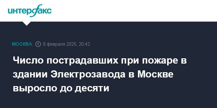 Москва. 8 февраля. INTERFAX.RU - Число пострадавших при пожаре в здании бывшего Электрозавода на востоке Москвы увеличилось до 10 человек, сообщили "Интерфаксу" в экстренных службах.