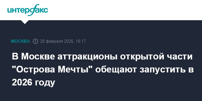 Москва. 25 февраля. INTERFAX.RU - В Москве обустройство открытой части развлекательного парка "Остров Мечты" должны завершить в 2026 году, рассказал основатель ГК "Регионы" и председатель правления компании "Остров мечты" Амиран Муцоев на встрече с президентом Владимиром Путиным.