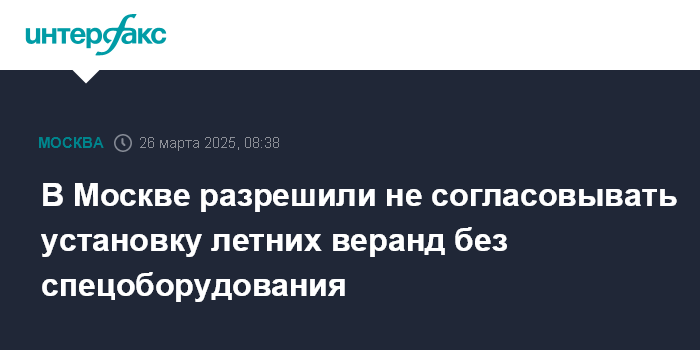 Москва. 26 марта. INTERFAX.RU - В Москве упростили порядок установки летних веранд без специального оборудования, теперь их можно размещать, не согласовывая проект, сообщил в Telegram мэр столицы Сергей Собянин.
