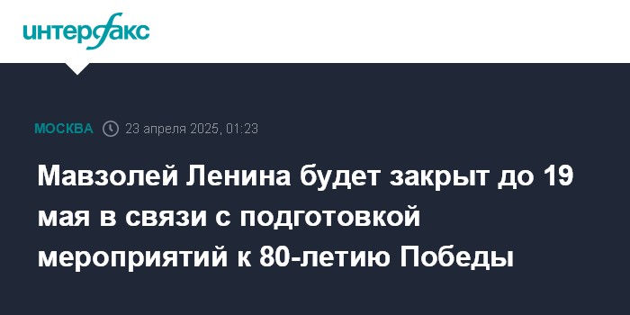 Москва. 23 апреля. INTERFAX.RU - Мавзолей Ленина на Красной площади закрывается до 19 мая в связи с подготовкой и проведением мероприятий к 80-летию Победы в Великой Отечественной войне.