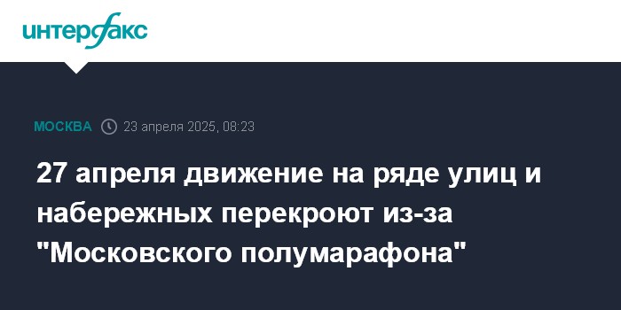 Москва. 23 апреля. INTERFAX.RU - Движение для транспорта будет временно закрыто 27 апреля на ряде улиц и набережных в центре столицы из-за "Московского полумарафона" (21,1 км), сообщили в телеграм-канале департамента транспорта Москвы.
