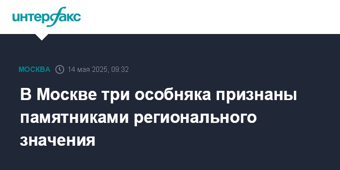 Москва. 14 мая. INTERFAX.RU - В Москве три исторических особняка получили статус памятников архитектуры регионального значения, сообщает Мосгорнаследие.