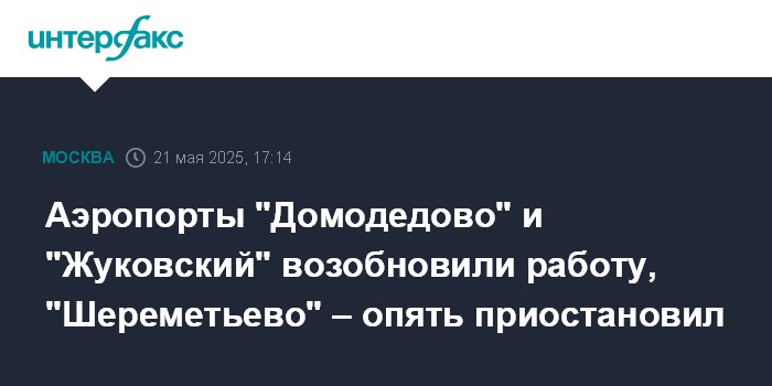 Москва. 21 мая. INTERFAX.RU - Аэропорты "Домодедово" и "Жуковский" возобновили работу после повторно вводившихся Росавиацией ограничений.