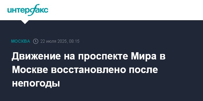 Москва. 22 июля. INTERFAX.RU - Столичный департамент транспорта сообщил о восстановлении движения на проспекте Мира после непогоды.