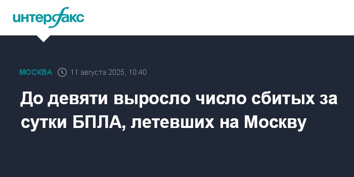 Москва. 11 августа. INTERFAX.RU - С начала суток нейтрализованы уже девять беспилотников, летевших в направлении Москвы, следует из сообщений в телеграм-канале мэра столицы Сергея Собянина.