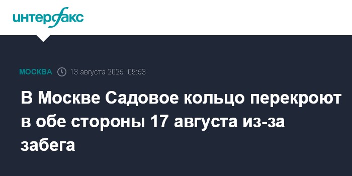В Москве Садовое кольцо перекроют в обе стороны 17 августа из-за забега
