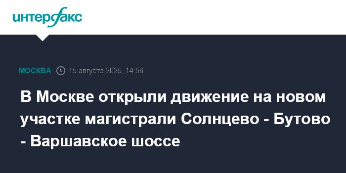 Москва. 15 августа. INTERFAX.RU - В столице открыто движение на новом участке магистрали Солнцево - Бутово - Варшавское шоссе, сообщил мэр Москвы Сергей Собянин.