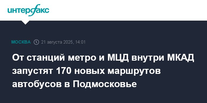 Москва. 21 августа. INTERFAX.RU - В ближайшие четыре года от станций метро и Московских центральных диаметров (МЦД) внутри МКАД планируют запустить 170 новых автобусных маршрутов в ближайшее Подмосковье, сообщил заммэра Москвы по вопросам транспорта и промышленности Максим Ликсутов. Об этом сообщает телеграм-канал Дептранса.