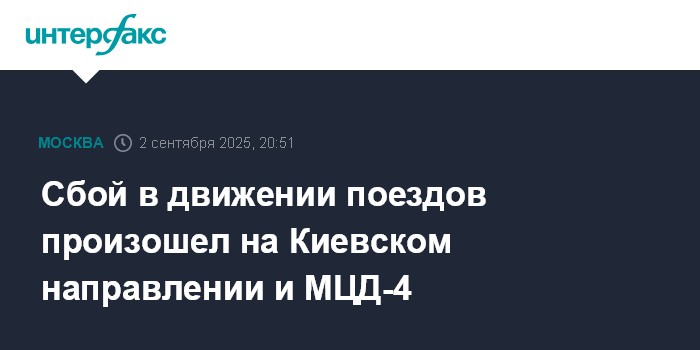 Москва. 2 сентября. INTERFAX.RU - Поезда Киевского направления и четвертой линии Московских центральных диаметров (МЦД-4, D4) следуют в сторону Апрелевки с отклонением от графика из-за остановки состава по техническим причинам, сообщили в Московской железной дороге (МЖД).