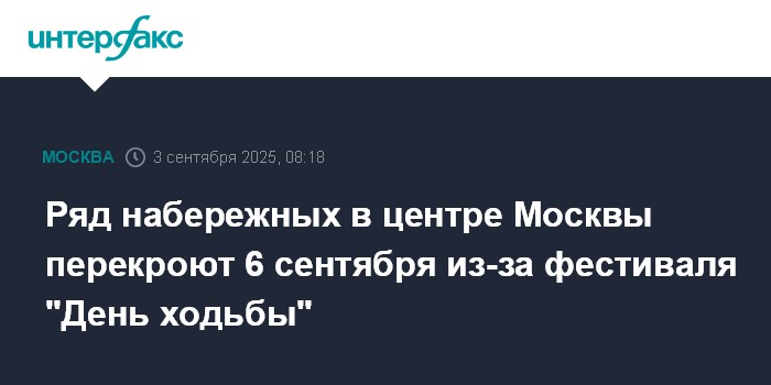 "6 сентября в связи с проведением фестиваля "День ходьбы" будет временно закрыто движение на ряде набережных в центре", - говорится в сообщении, размещенном в телеграм-канале департамента в среду.