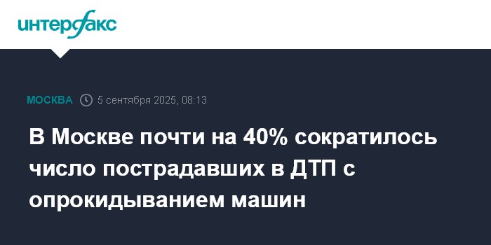 Москва. 5 сентября. INTERFAX.RU - В Москве в январе-июле 2025 года в ДТП с падением или опрокидыванием автомобилей, мотоциклов и средств индивидуальной мобильности (СИМ) пострадали на 37% меньше человек, чем за тот же период 2024 года, сообщили "Интерфаксу" в пресс-службе Центра организации дорожного движения (ЦОДД).