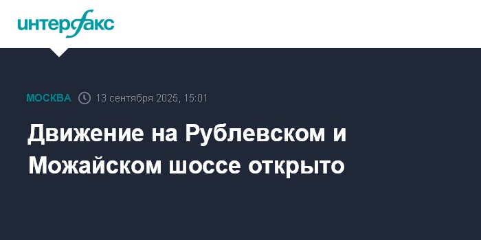 Москва. 13 сентября. INTERFAX.RU - Столичный департамент транспорта сообщил в своем телеграм-канале об открытии движения на Рублевском и Можайском шоссе после временного закрытия.