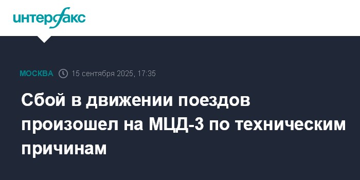 Москва. 15 сентября. INTERFAX.RU - Пригородные поезда на третьей линии Московских центральных диаметров (МЦД-3) задерживаются в сторону Москвы из-за технического сбоя, сообщили в Московско-Тверской пригородной пассажирской компании (МТППК).
