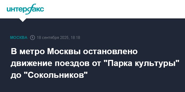 Москва. 18 сентября. INTERFAX.RU - На Сокольнической линии московского метро из-за человека на путях нет движения от станции "Парк культуры" до станции "Сокольники", сообщает департамент транспорта столицы в своем телеграм-канале.
