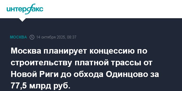 Москва. 14 октября. INTERFAX.RU - Москва планирует заключение концессии на строительство платной автотрассы от Новорижского шоссе до Северного обхода Одинцово протяженностью 18,6 км, говорится в проекте концессионного соглашения, опубликованного на портале ГИС "Торги".