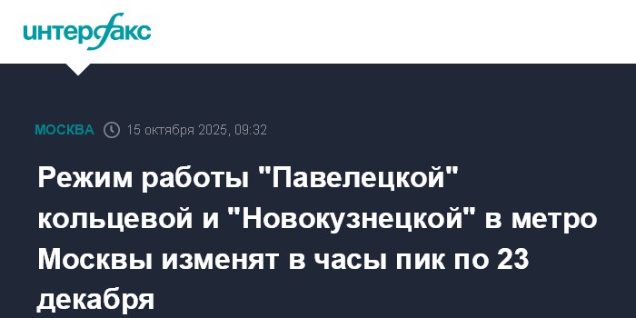 "С 16 октября по 23 декабря 2025 года в связи с ремонтом эскалатора на станции "Павелецкая" Кольцевой линии изменится режим работы", - говорится в сообщении, размещенном в телеграм-канале департамента в среду.