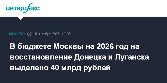 Москва. 15 октября. INTERFAX.RU - В проекте бюджета Москвы на 2026 год на на восстановительные работы и развитие инфраструктуры в Донецке и Луганске заложено 40 млрд рублей. Проект опубликован на сайте Мосгордумы.