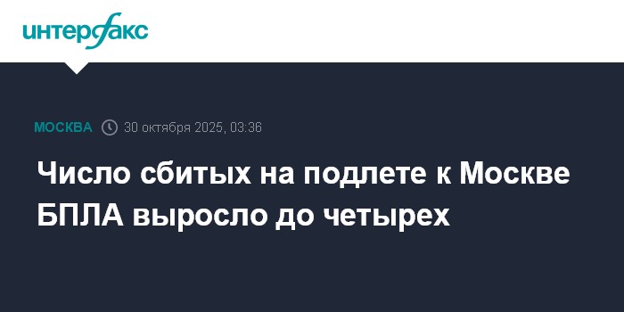 Москва. 30 октября. INTERFAX.RU - Системой ПВО уничтожены еще два БПЛА, летевших в сторону Москвы, сообщил мэр столицы Сергей Собянин.
