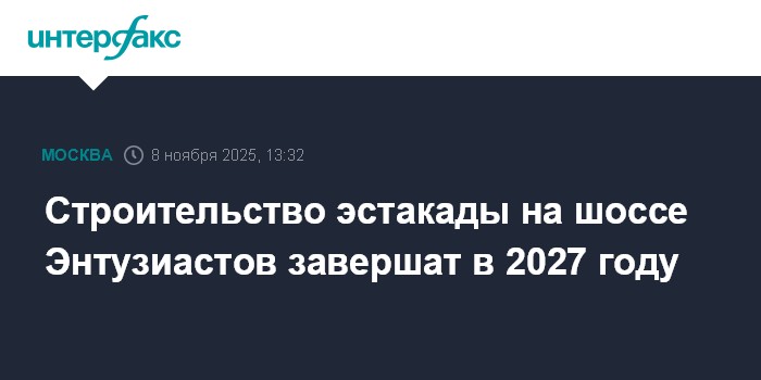 Москва. 8 ноября. INTERFAX.RU - Готовность эстакады на пересечении шоссе Энтузиастов с Большим Купавенским проездом и Свободным проспектом составляет 20%, работы планируется завершить в 2027 году, сообщил в субботу мэр Москвы Сергей Собянин.