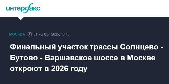Москва. 21 ноября. INTERFAX.RU - Крупнейший дорожный проект Москвы – трасса Солнцево - Бутово - Варшавское шоссе – будет завершен в 2026 году, в настоящий момент строится финальный участок от улицы Поляны до Варшавского шоссе, сообщил мэр Москвы Сергей Собянин.