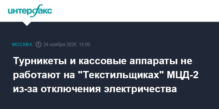 Москва. 24 ноября. INTERFAX.RU - Турникеты, кассовые аппараты и информационные табло не работают на станции "Текстильщики" Курского направления Московской железной дороги (МЖД) и второй линии Московских центральных диаметров (МЦД-2, D2) из-за нарушения подачи электроэнергии, сообщили "Интерфаксу" в пресс-службе МЖД.