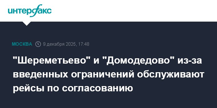 Москва. 9 декабря. INTERFAX.RU - Аэропорт "Шереметьево" в связи с введением ограничений на использование воздушного пространства принимает и отправляет рейсы по согласованию с соответствующими органами, сообщила Росавиация.