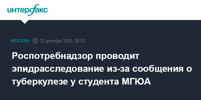 Москва. 22 декабря. INTERFAX.RU - Столичное управление Роспотребнадзора сообщило о проведении эпидемиологического расследования в связи с информацией о случае подозрения на туберкулез у студента Московского государственного юридического университета имени О.Е. Кутафина (МГЮА).