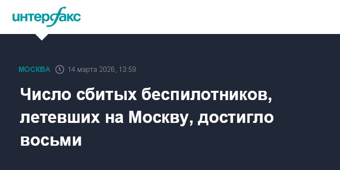 Москва. 14 марта. INTERFAX.RU - Мэр Москвы Сергей Собянин сообщил о еще трех сбитых БПЛА, летевших в направлении столицы, общее количество уничтоженных за субботу БПЛА выросло до восьми.