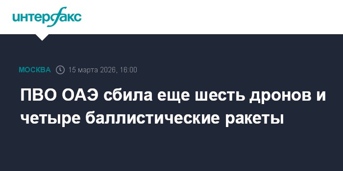 Москва. 15 марта. INTERFAX.RU - Средства ПВО ОАЭ в воскресенье уничтожили шесть БПЛА и четыре баллистические ракеты, которые были запущены из Ирана, сообщает телеканал "Аль-Джазира" со ссылкой на заявление военных.