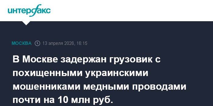Москва. 13 апреля. INTERFAX.RU - Столичные правоохранительные органы задержали водителя грузовика с похищенными у уральского производителя медными проводами почти на 10 млн рублей, сообщила официальный представитель МВД России Ирина Волк.