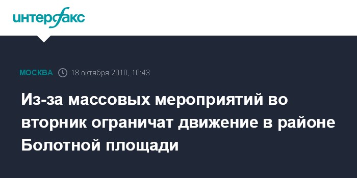Москва. 18 октября. INTERFAX.RU - Движение транспорта в районе Болотной площади будет ограничено во вторник из-за массовых мероприятий, сообщили "Интерфаксу" в отделе пропаганды безопасности дорожного движения управления ГИБДД ГУВД Москвы.