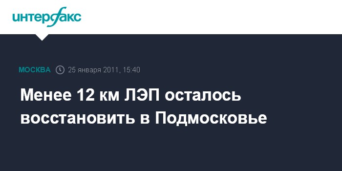 Москва. 25 января. INTERFAX.RU - Энергетики ОАО "Московская объединенная электросетевая компания" (МОЭСК), ОАО "Холдинг МРСК" и подрядных организации продолжают работу на трассах ЛЭП 35-110 кВ и в распределительных сетях по восстановлению надежного электроснабжения Московского региона.
