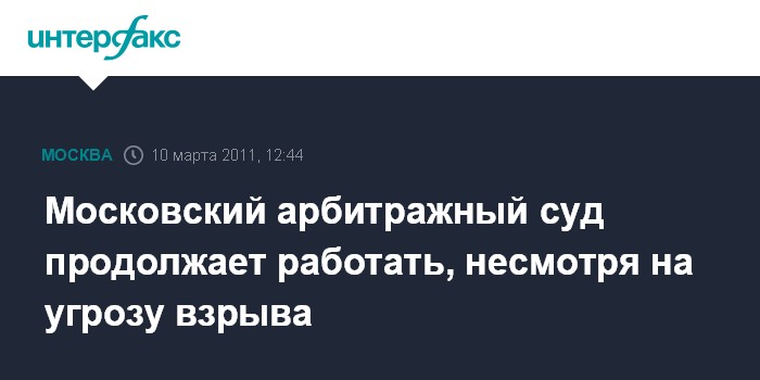 Москва. 10 марта. INTERFAX.RU - Арбитражный суд Москвы продолжает работу, несмотря на звонок неизвестного о якобы заложенном в здании взрывном устройстве.