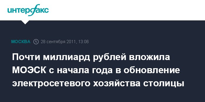 Москва. 28 сентября. INTERFAX.RU - Филиал ОАО "Московская объединенная электросетевая компания" (МОЭСК) - Московские кабельные сети - за 8 месяцев 2011 года направил на ремонтные работы более 990 млн рублей.