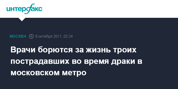 Москва. 9 октября. ИНТЕРФАКС - Врачи борются за жизнь троих граждан Киргизии, пострадавших в драке на станции метро "Рижская", сообщил "Интерфаксу" источник в медицинских кругах.