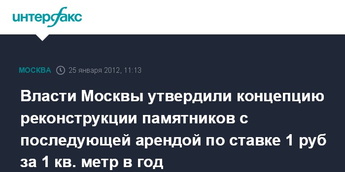 Власти Москвы утвердили концепцию реконструкции памятников с последующей арендой по ставке 1 руб за 1 кв. метр в год