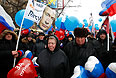 Как и на Поклонной горе, участники митинга боролись с холодом с помощью горячительных напитков. К моменту появления на сцене Владимира Путина многие были уже основательно навеселе. Пока же на арене ничего не происходило - на экранах один за другим демонстрировались заблаговременно выложенные на YouTube ролики, в которых знаменитости - от космонавта Алексея Леонова до звезды Comedy Club Михаила Галустяна - призывали голосовать за Владимира Путин