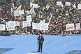 Наконец ведущие объявили гвоздь программы. В отличие от других ораторов, взбегавших на сцену сразу после объявления своего имени, кандидат в президенты Владимир Путин заставил аудиторию подождать. Увидев в центре арены премьер-министра, толпа, из-за холода, казалось, потерявшая интерес к происходящему, взорвалась овацией. "Дорогие друзья! Я приветствую всех вас сегодня, Всех, кто пришли сегодня на стадион, и тех, кто находятся за его стенами", - начал кандидат в президенты. "Привет, как дела, - неожиданно вступила в диалог с оратором стоявшая со мной по соседству девушка. - У нас хреново". Путин, впрочем, этого не слышал.