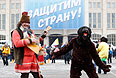 Пройдя по заставленному автобусами Хамовническому валу, я, наконец, оказался у входа на территорию спорткомплекса. Происходящее за металлоискателями сильнее всего напоминало не политическую акцию, а какой-нибудь фестиваль пива. Граждан развлекали ростовые куклы, различного рода аниматоры и даже какая-то группа, исполнявшая русские народные песни у подножия установленного перед Большой спортивной ареной памятника Ленину.