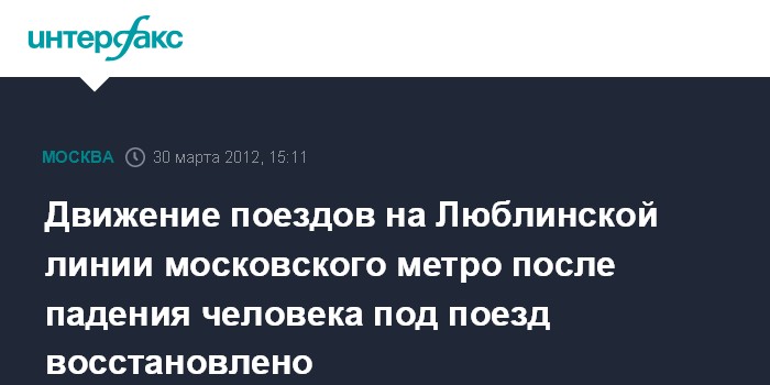 Москва. 30 марта. INTERFAX.RU - В настоящее время движение поездов по Люблинско-Дмитровской линии московского метро входит в график после падения пассажира под поезд на станции "Волжская" в пятницу днем. Как сообщили "Интерфаксу" в пресс-службе метрополитена, с 14:01 до 14:48 для извлечения человека с путей по направлению в центр на станции снималось напряжение контактного рельса; в это время не ходили поезда от станции "Зябликово" до "Волжской".