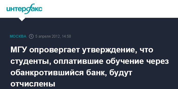 Москва. 5 апреля. INTERFAX.RU - В МГУ заверяют, что не будут отчислять студентов, оплативших обучение через обанкротившийся банк.