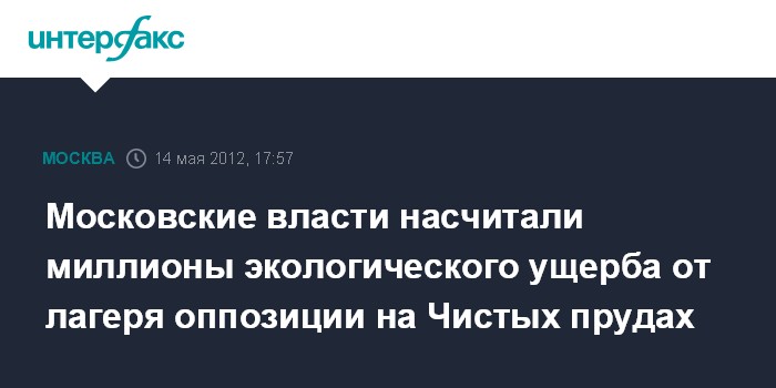 Москва. 14 мая. INTERFAX.RU - Ущерб, нанесенный оппозиционерами экологии на Чистопрудном бульваре, оценивается в несколько миллионов рублей, сообщили "Интерфаксу" в пресс-службе департамента природопользования и охраны окружающей среды Москвы. "Было установлено, что вытоптано около 2 тыс. кв.м газонов, есть повреждения деревьев, так как на них прикреплялись различные предметы", - сказал сотрудник пресс-службы.